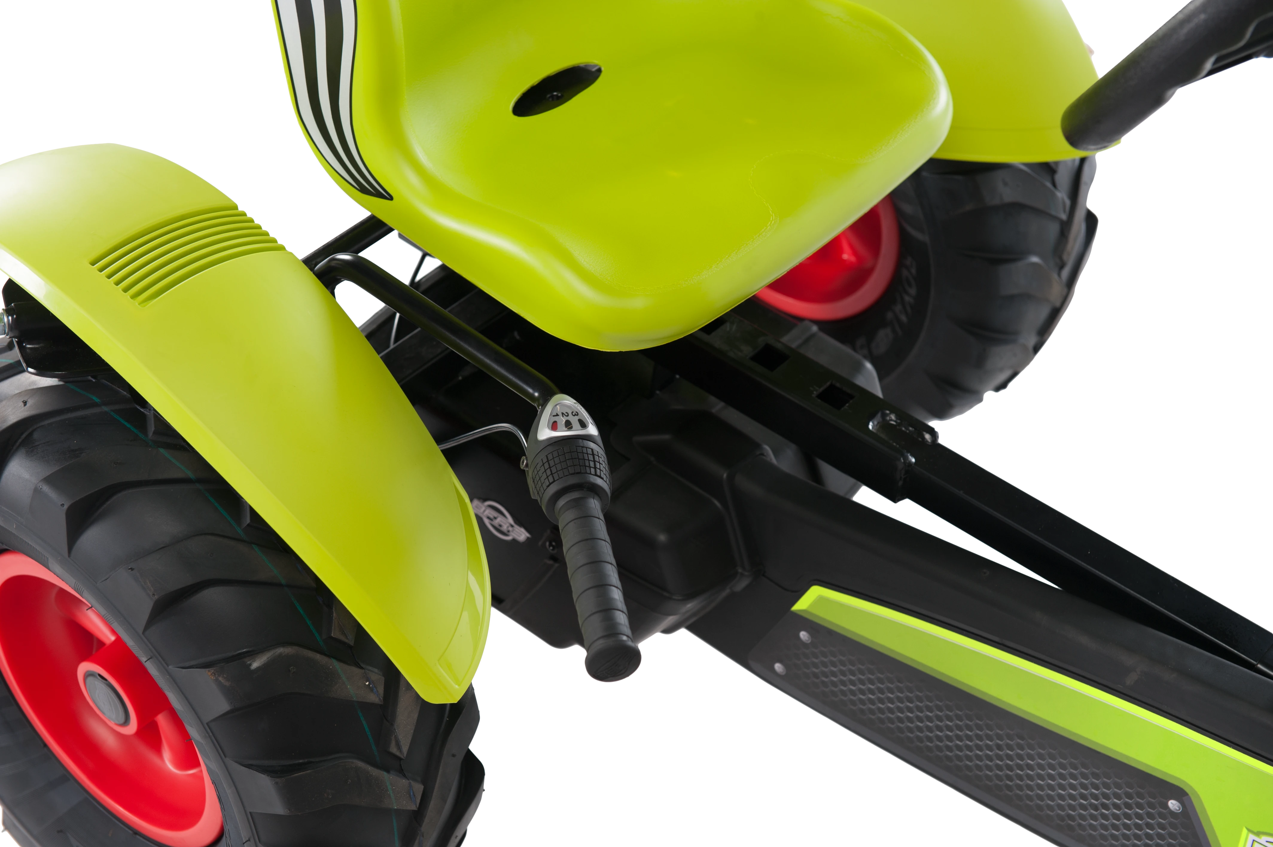 BERG CLAAS został wyposażony w cztery pompowane opony, które poprawiają przyczepność i wygodę jazdy. W porównaniu z kołami pełnymi: