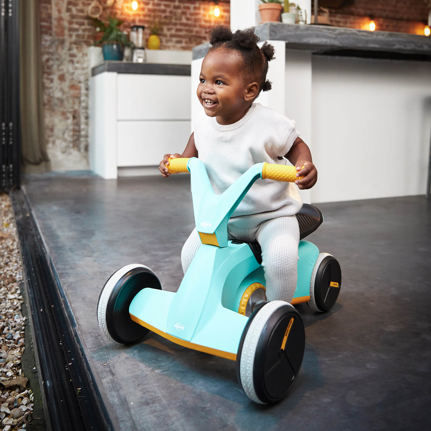 Dzięki czterem kołom BERG GO stoi mocno na ziemi i ma doskonałą stabilność. Sprawia to, że najmniejsze dzieci mogą bezpiecznie jeździć w swoim fajnym pojeździe. Dzięki jeździkowi BERG GO możesz pozwolić dziecku na beztroską jazdę w domu i na zewnątrz!